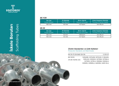 Dış Çap Et Kalınlığı Birim Ağırlık Çinko Kaplama Kalınlığı Wall Thickness 0,70 - 13,0 mm Wall Thickness 1,8 - 8 mm