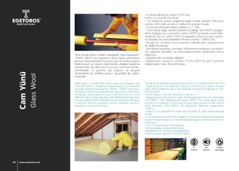 sonucu oluşmaktadır. Kullanım yeri ve amacına göre • Kaplamasız camyünü ürünler TS EN 13501-1’e göre “yanmaz and with dierent technical properties, with dierent • Ürün tipine bağlı olarak kullanım sıcaklığı -50/+650°C