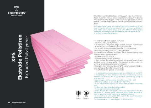 XPS Ekstrüde Polistiren Extruded Polystyrene • Kapiler emiciliği yoktur. EPS Ekspande Polistiren Expande Polystyrene • Kullanım sıcaklığı -50/+75°C aralığındadır.