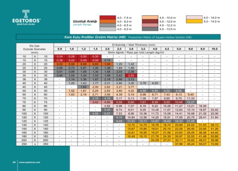 4,0 - 7,5 m 4,0 - 10,0 m 4,0 - 14,0 m Kare Kutu Profiller Üretim Matrisi (CR) Production Matrix of Square Hollow Section (CR)